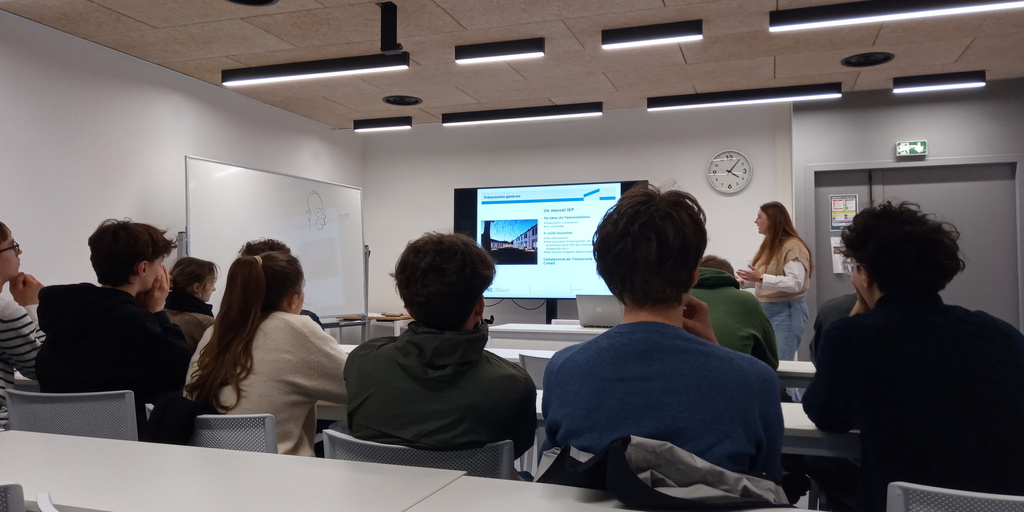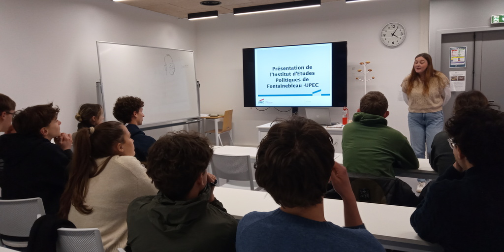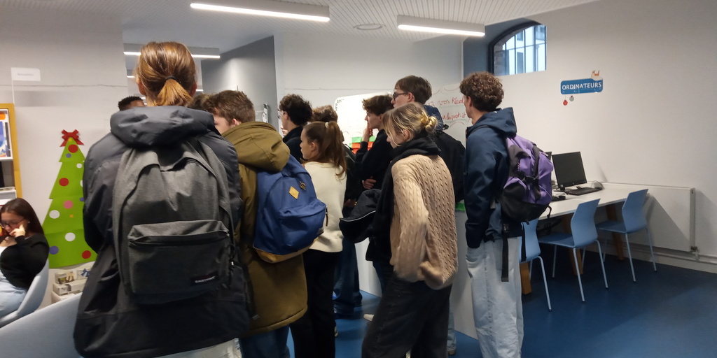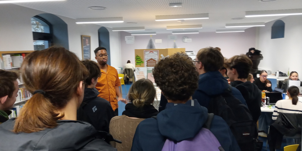 Un an après son inauguration, le Centre de documentation Thierry Santurenne de l'IEP de Fontainebleau accueillait en ses murs les aspirants politistes et juristes PSP-DGEMC ce mercredi 3 décembre 2025 après-midi. Nos étufiants ont suivi avec intérêt les présentations conjointes d'Emmanuelle Rolland (Responsable des bibliothèques de l'IEP et de l'IUT de Fontainebleau) et son assistant bibliothécaire, et de Julie Siefridt (Gestionnaire des enseignements de l'IEP) en trois groupes successifs.