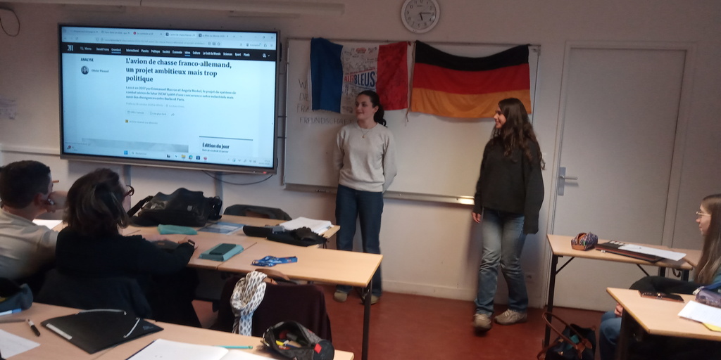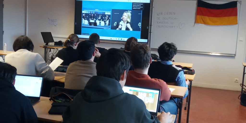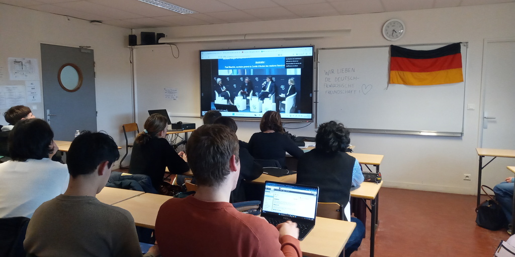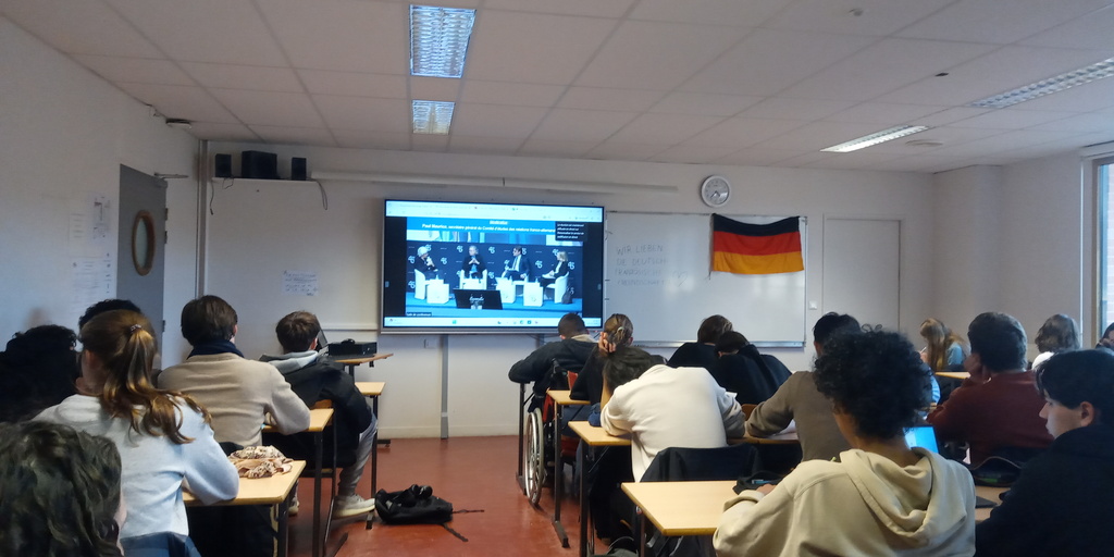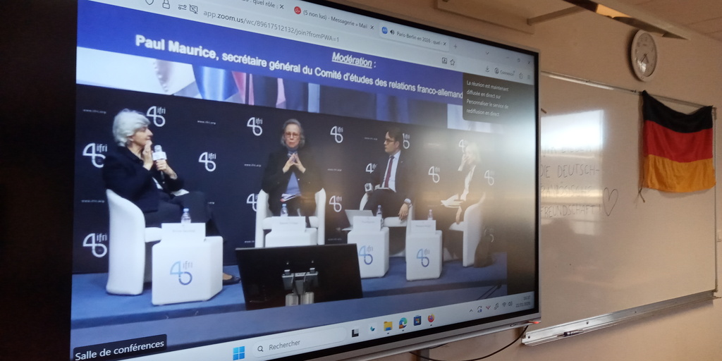 Cette belle opportunité a permis aux élèves de se sensibiliser aux échanges franco-allemands cette fois-ci dématérialisés, politiques et culturels entre Sylvie Goulard (ancienne ministre des armées, députée européenne et présidente du dfi, l'institut franco-allemand de Ludwigsburg que les élèves présents de 1ère SED ont découvert il y a pile un an, en janvier 2025), Sabine Thillaye, députée présidente du groupe d'amitié franco-allemande à l'Assemblée nationale, et Michaela Wiegel, correspondante en France de la FAZ, quotidien de référence de la presse allemande.