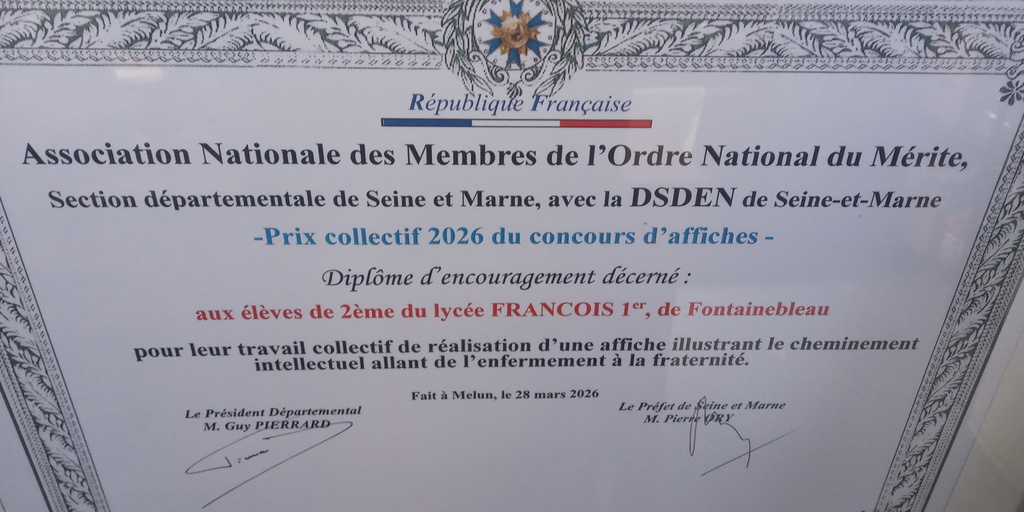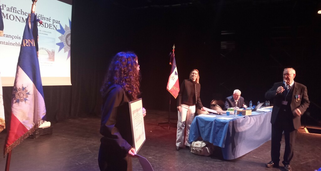 Samedi 28 mars à Nemours s'est tenue l'Assemblée générale de l'ANMONM (Association Nationale des Membres de l'Ordre National du Mérite) section Seine-et-Marne. Y furent remis les prix décernés aux lauréats de la première édition des actions et concours lancés cette année 2025-26 par l'ANMONM, dont celui d'affiches promouvant l'éducation à la citoyenneté.