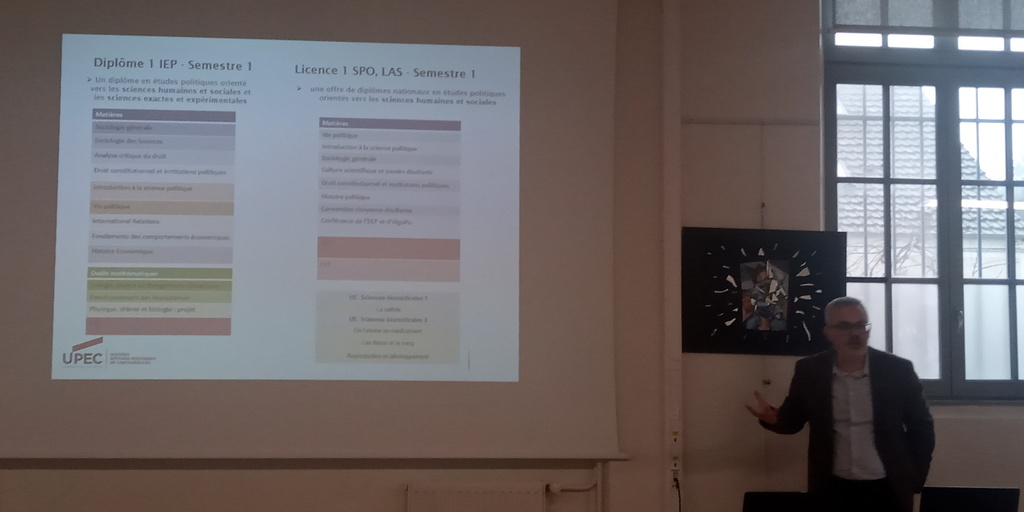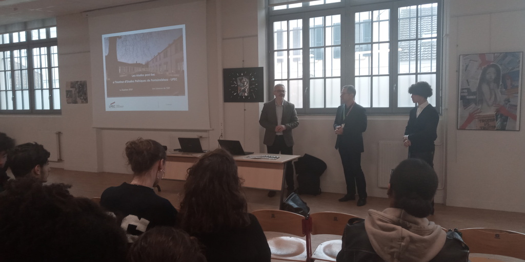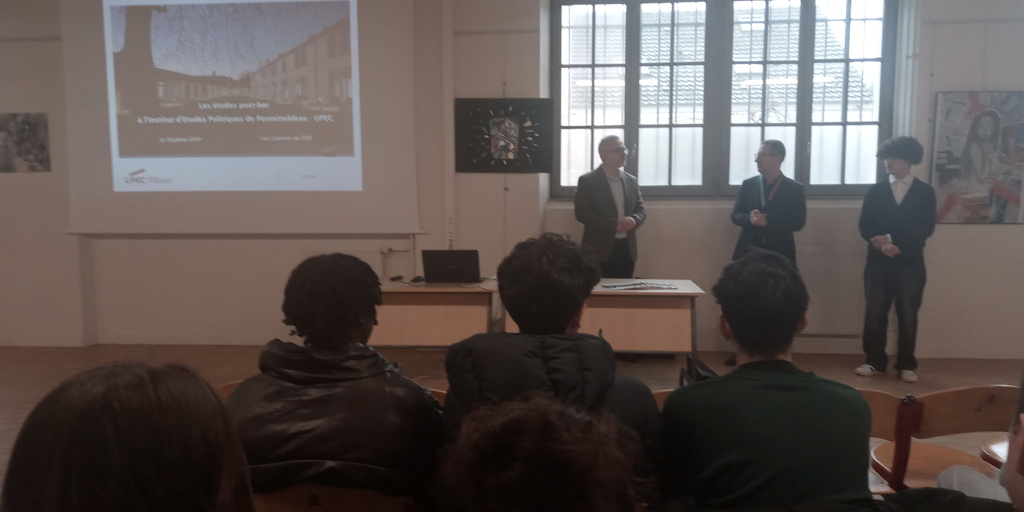 Fabrice Hamelin (Directeur Adjoint - Directeur des études - Professeur de sociologie) et Kaïs Sefiane (1ère année du diplôme IEP - délégué et ambassadeur IEP) sont venus présenter les formations et cursus dispensés par l'IEP de Fontainebleau (diplôme IEP bien sûr, mais aussi licence de sciences politiques, double licence, PPPE...) aux aspirants politistes et juristes PSP-DGEMC, 14h30-16h salle A01. Une rencontre stimulante et riche en informations!